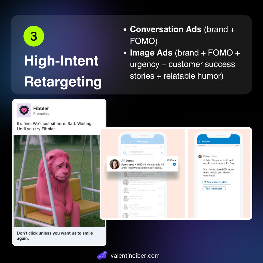 Reach out via Conversation Ads to everyone who engaged with your Cold and Retargeting-Layer Thought Leader Ads. In addition, use Image Ads to showcase Success Stories and to create FOMO.